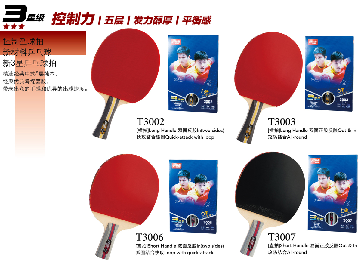 3 Star racket with 5-ply well selected Chinese pure wood plus classic sponge rubber. Provides excellent hand feel, good speed, nice balance and great power. It will help the player easily switch between attack and defend by playing technically.