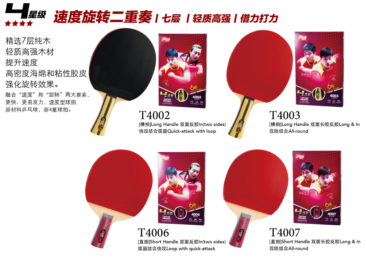 4 Star racket designed for quick-attack with loop table tennis racket. It is a fast-offensive professional table tennis racket. 7 ply pure wood and high-strength wood with good rubbers attached bring the rackets more power.