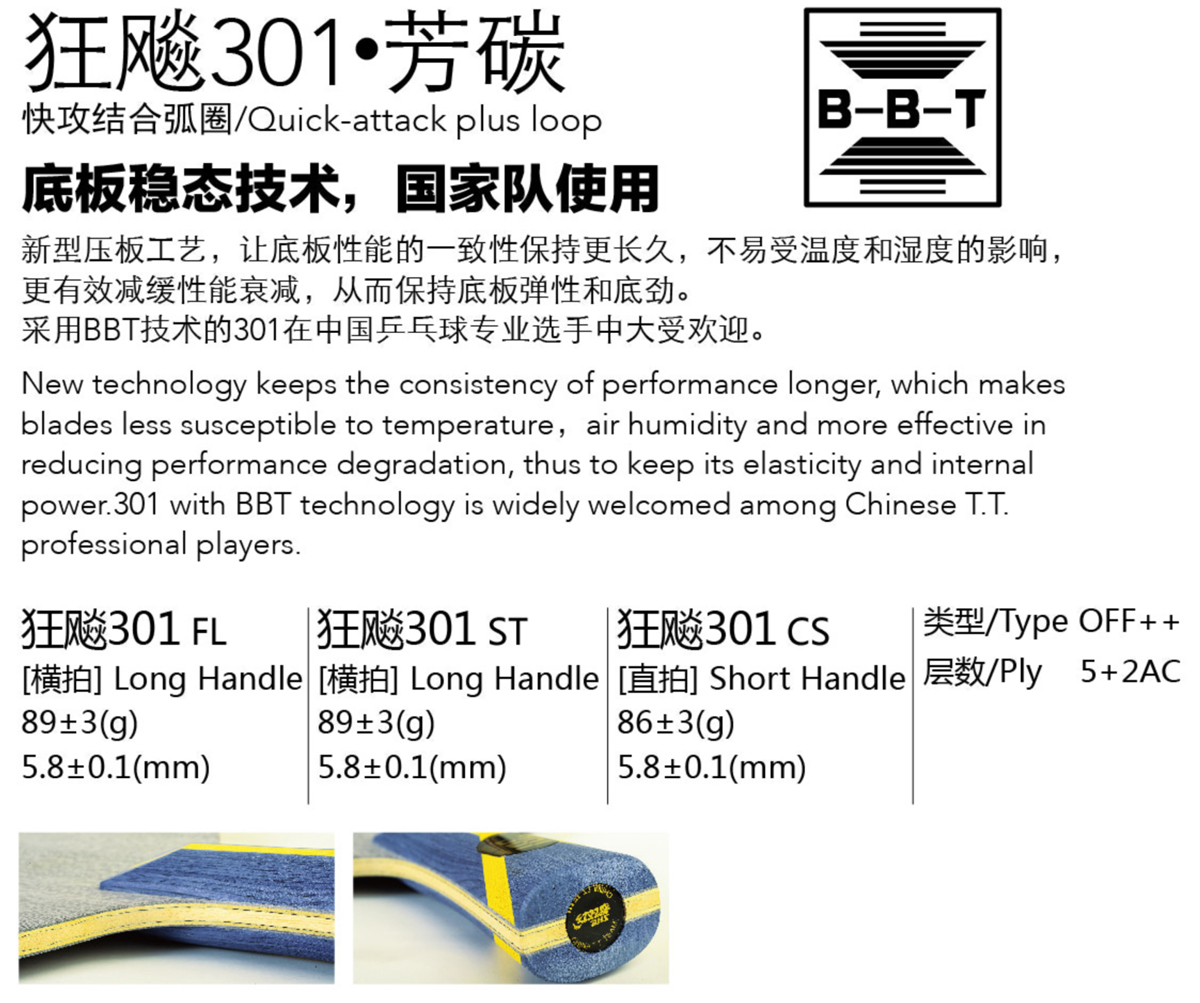 New technology keeps the consistency of performance longer, which makes blades less susceptible to temperature, air humidity and more effective in reducing performance degradation, thus to keep its elasticity and internal power. 301 with BBT technology is widely welcomed among Chinese T.T. professional players.