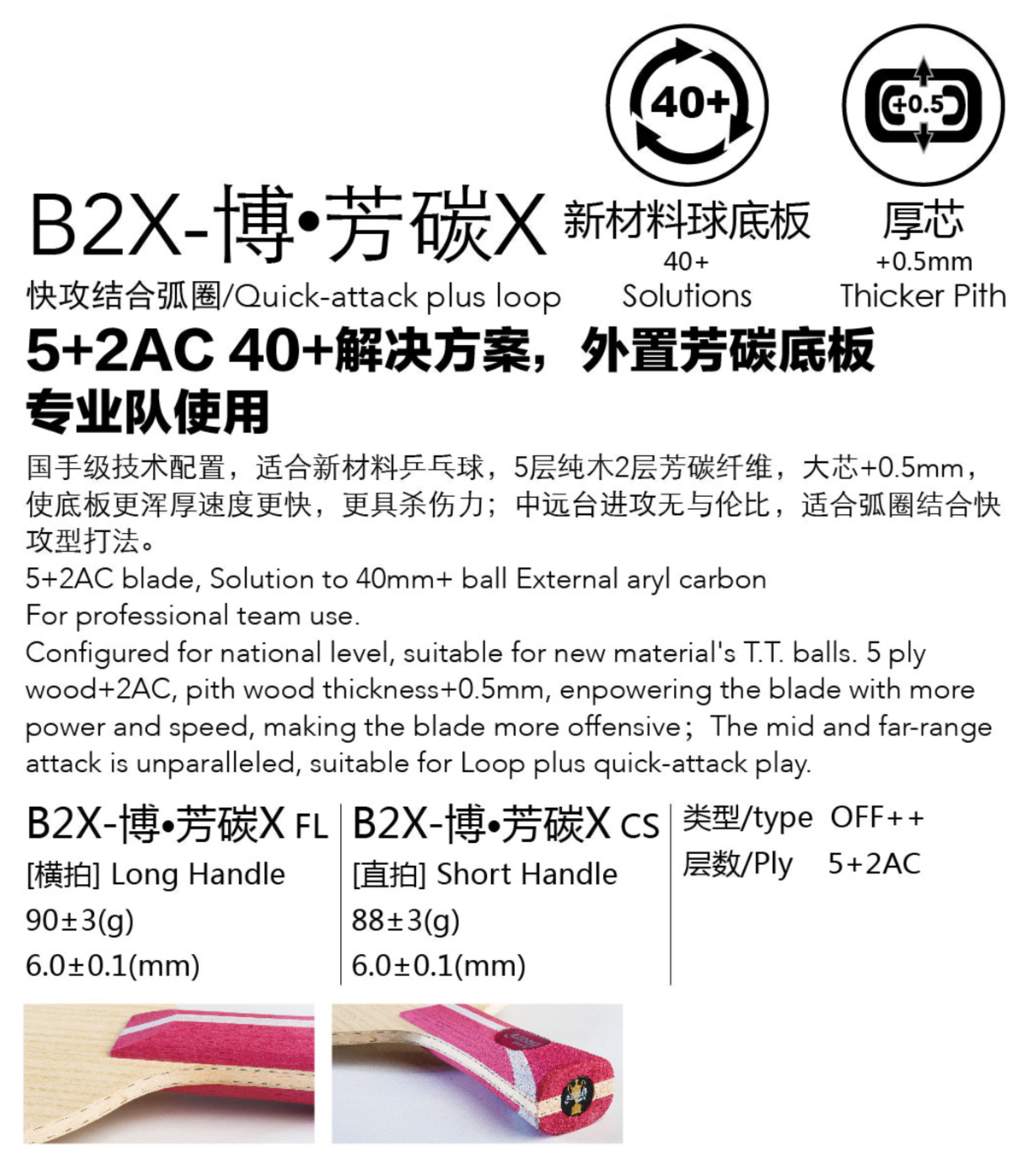5-ply wood blade, good control and fast speed. It’s a balanced blade which strong at attacking, friendly to starters.