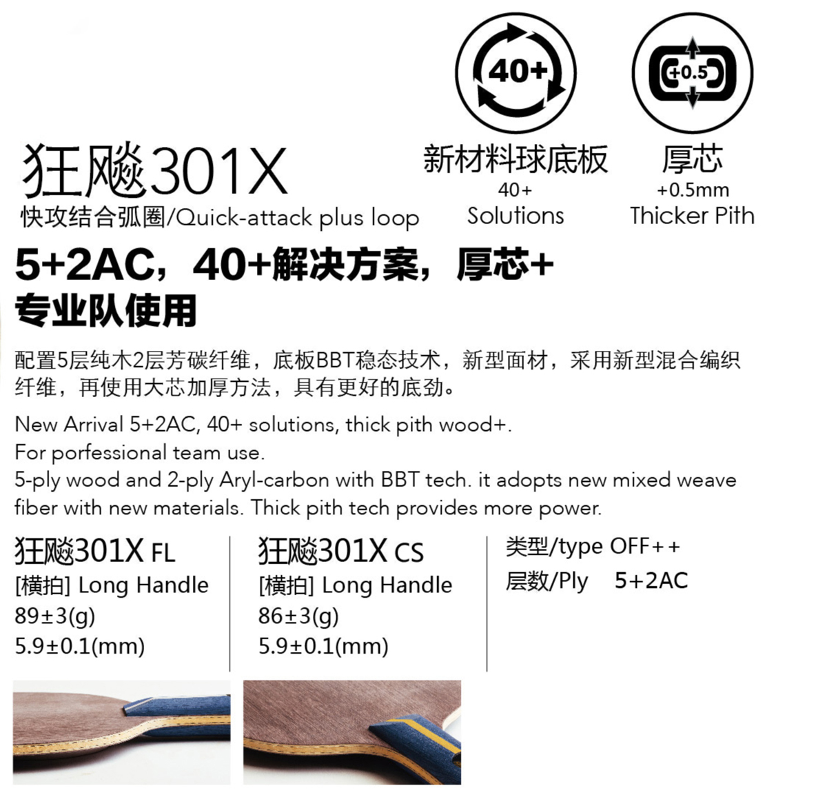 New technology keeps the consistency of performance longer, which makes blades less susceptible to temperature, air humidity and more effective in reducing performance degradation, thus to keep its elasticity and internal power. 301 with BBT technology is widely welcomed among Chinese T.T. professional players.