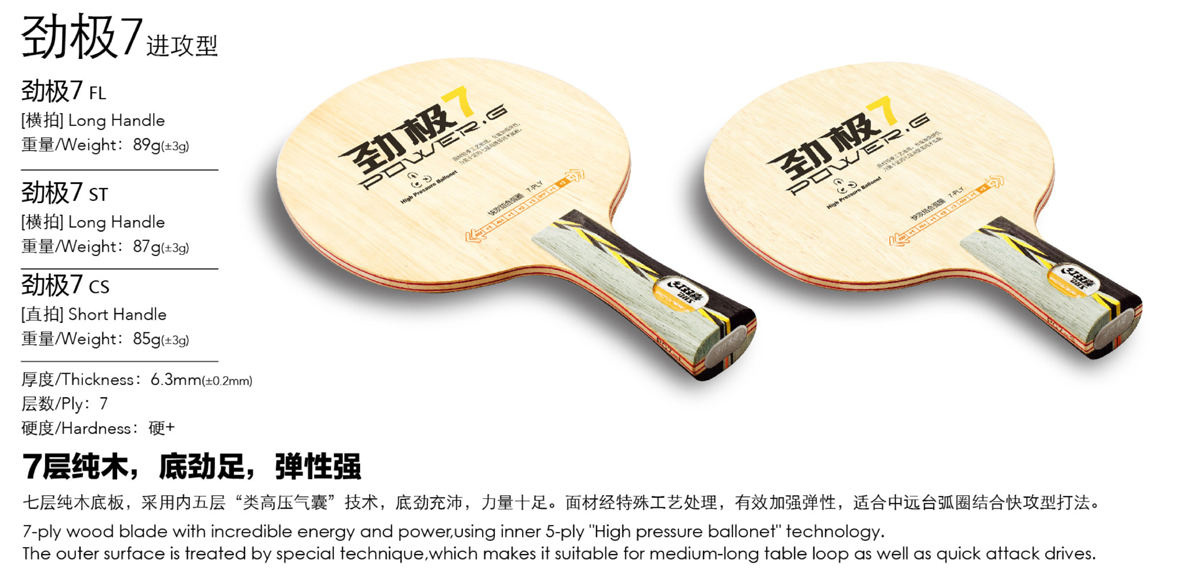 7-ply wood blade with incredible energy and power, using using inner 5-ply “high pressure ballonet” technology.