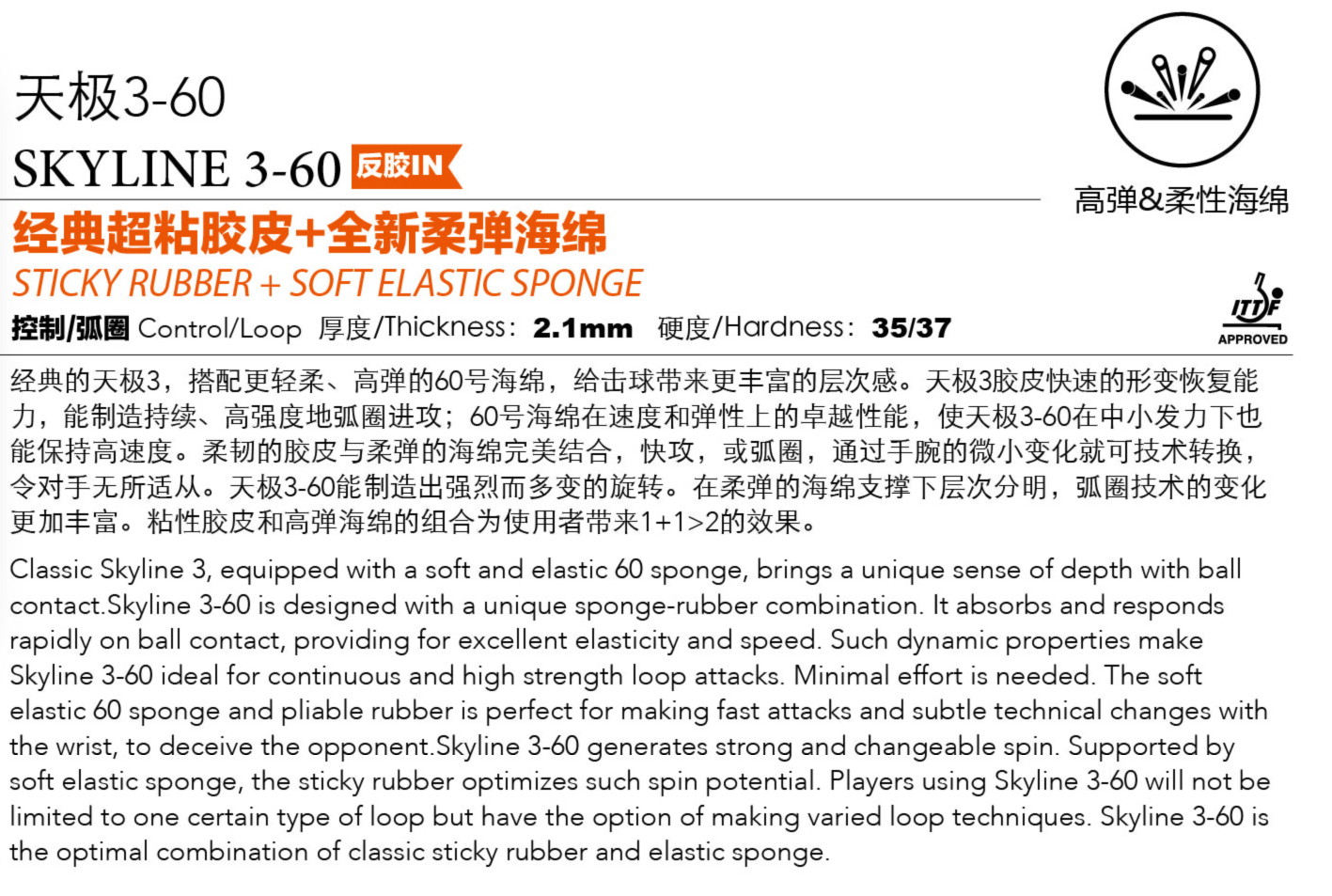 Players using Skyline 3-60 will not be limited to one certain type of loop but have the option of making varied loop techniques. Skyline 3-60 is the optimal combination of classic sticky rubber and elastic sponge.